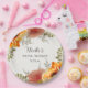 Elegantes platos de papel personalizados para despedida de soltera con estilo vintage, flores de acuarela de color naranja quemada y coral, y follaje verde. Personalizados con el nombre de la futura novia y la fecha de su despedida de soltera.