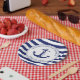 El complemento perfecto para la ducha de novia que estás tirando son estos platos de papel náutico inspirados en la costa. El diseño cuenta con un ancla azul marino con cuerda sobre fondo rayado azul y blanco. Puede personalizar la tipografía curvada con la novia para que sea el nombre y la fecha de ducha de la novia.