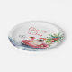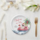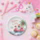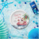 Celebra la temporada con este diseño festivo y divertido de plato de papel, perfecto para una reunión soleada de Navidad en julio. Cuenta con un Santa Claus relajado con gafas de sol descansando en un flotador de flamenco rosa, rodeado de olas del océano y toques tropicales, lo que aporta un ambiente divertido y playero a tu celebración.