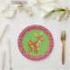 Invitación de vacaciones reno lindo en un fondo verde con una franja roja con lunares blancos. Reno por Pixabay.
