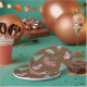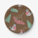 Un plato de papel de Navidades marrones con un encantador diseño de abetos, pájaros vestidos con sudaderas con arbustos, hojas verdes y huecas, brotes de bayas y mantas llenas de regalos navideños para añadir un toque único y caprichoso a tu casa de estos Navidades.