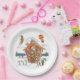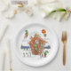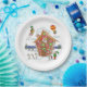 Estos platos de papel presentan un ilustracion divertido, cómico y colorido de Santa en una casa de pan de jengibre cubierta de caramelos. Noten el patinaje sobre hielo de los elfos, saludando a Santa, montando en un globo de aire caliente, e incluso montando un cohete.