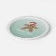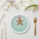 Este plato de Navidad para el intercambio de galletas presenta a un lindo hombre de pan de jengibre con un sombrero de Santa. El fondo es un suave verde azulado con puntos blancos de confeti para parecer nieve cayendo.