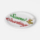 Platos de papel con saludos de temporada en letras verdes y rojas 3D y un reno. Placas disponibles en varios tamaños.