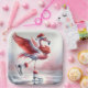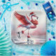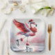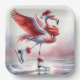 Un flamingo con alas estiradas lleva un sombrero de Santa y una bufanda roja que patina sobre hielo con gracia.