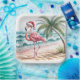 Un flamingo con un sombrero de Santa se pasea por una playa de arena con olas que se estrellan suavemente cerca