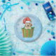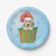 Celebra la temporada de fiestas con un adorable perrito inglés Setter vestido con un sombrero de Santa en una caja de regalo brillante rodeada de copos de nieve y con las palabras, ¡Feliz Amanecer!