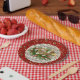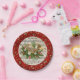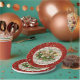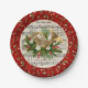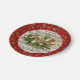 La pieza central de estos platos de papel es un cuerno francés decorado para Navidades con pinares, hojas huecas, bayas rojas y flores, contra un villancico de papel vintage. Alrededor del borde hay un fondo metálico falso rojo con un patrón de notas de música dorada.