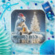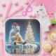 Un oso polar con un sombrero de Papá Noel sostiene una taza de cerveza mientras se sienta en un piso de hielo junto a un árbol de Navidad decorado