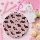 Perros escoceses adornados con ropa de fiesta, sombreros de Santa y jersey de argyle con adornos navideños dispersos en un fondo rosado.