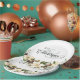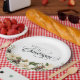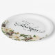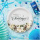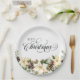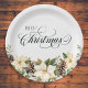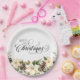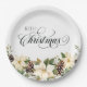 Placa redonda de papel con Navidades en un guión de diseño y acuarela Poinsettia, bayas y conos de pino como elementos de diseño. Elegantes platos de papel de temporada para el fiesta de sus Navidades o el evento de vacaciones. Viene de fondo blanco y azul profundo. Aquí sobre un fondo blanco. Feliz celebración de fiestas. Vea los demás productos coincidentes de esta colección para ver un tema cohesivo.