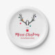 Una imagen minimalista divertida, linda y moderna de cabeza de reno con nariz roja. Con adornos navideños, se colgaban de los cánticos. Sin color de fondo, colores: blanco, rojo, gris, azul, verde. Un guión rojo moderno de estilo manuscrito con el texto: Feliz Navidad. Plantilla para el nombre o el texto de su familia.