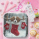 Un cachorro de St. Bernard aspira a un Navidad rojo sembrando el caldo en una línea entre dos mitones coincidentes