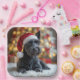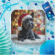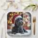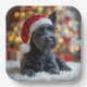 Un perro de terror escocés negro con sombrero de Santa se sienta en una alfombra esponjosa frente a un árbol navideño festivo adornado con luces.