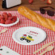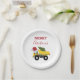 Un lindo ilustracion de un Navidad arroja un camión vehículo de construcción de camiones usando un sombrero de Papá Noel y decorado con luces de Navidades con palabras "Feliz Navidad" que transportan un árbol de Navidad festivo. Perfecto para niños y chicas que aman los camiones de construcción, los camiones de juguete o la maquinaria pesada. Un plato de papel ideal para los Navidades de camiones volquete grandes o pequeños, chicas o niños.