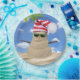 Navidades tropicales y snowman con gorra de reposición de rayas rojas y blancas y gafas de sol verdes sobre la arena.