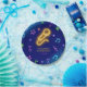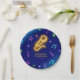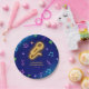 Elegante plato de papel de cumpleaños con micrófono de neón amarillo y notas de música coloridas en suelo negro azul oscuro.