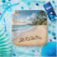 A tropical beach scene shows the year "2026" written in the sand, with waves gently lapping at the shore with palm trees