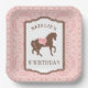 Este diseño de placa de cumpleaños de cowgirl incluye un borde de cuerda con una etiqueta personalizada. En el centro de la etiqueta hay un caballo con las palabras "octavo cumpleaños". El fondo es un patrón de bandana rosada. Puede personalizar con un nombre y una fecha. La manera perfecta de vestir tu mesa para tu fiesta vaquera. ¡YeeHaw!