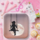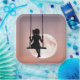 Silueta de niña en un columpio con luna llena en un cielo rosa.