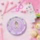Papel morado con motivos de ducha con pequeñas rubias con pelo hispano o afroamericano sosteniendo un oso de peluche.