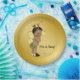 Las placas de papel de bebé de bebe con un adorable bebé afroamericano usando un lindo traje de abeja de burbujas en un rico fondo dorado con abejas voladoras de burbujas. Puede agregar texto para personalizar estos platos de papel de bebé de abejas negras y doradas, y puede eliminar el fondo dorado para añadir el color de su elección.