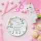 ¡Celebra el primer cumpleaños de tu bebé con este adorable y personalizado plato de papel de fiesta con tema de dinosaurios! Perfecto para un lindo fiesta de 1 cumpleaños de dinosaurios, estos platos presentan deliciosos ilustraciones de lindos dinosaurios en blues y verdes, alegremente sosteniendo globos azul y amarillo de los puntos polka. El diseño es lúdico y se complementa con las frases "Stomp Chomp Roar" y "Dinosaurus Fun", que le dan un toque festivo. Con un fondo blanco y nítido, los platos están adornados con hojas y follaje verdes y suaves, lo que crea un ambiente acogedor y cohesivo para el día especial de tu hija. Hacer que el primer cumpleaños de tu pequeño sea inolvidable con estos encantadores y divertidos platos de papel fiesta.