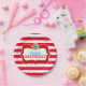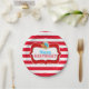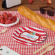 Un diseño moderno, divertido y luminoso de rayas horizontales de color rojo y blanco brillantes en las que se centra un cartel rojo y blanco con vieiras que tienen estilo de escritura festivo y fuentes decorativas que dicen "feliz cumpleaños"