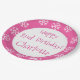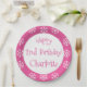 Placas Personalizadas De Papel De Aniversario De La Fiesta De Aceite De Snowflake De Color Rosa. Un fondo divertido de copos de nieve rosa y blanco. Círculo blanco con letra rosa bonito dice Feliz cumpleaños. Personalice con edad y nombre. Fiesta de cumpleaños rosa brillante y adorable para una fiesta de cumpleaños temática invernal para niñas pequeñas.