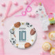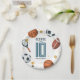 Este diseño de placas de papel de cumpleaños para niños, de temática deportiva, es bonito y moderno y cuenta con un diseño de personalizados deportivos, con baloncesto, fútbol, baloncesto, raqueta de tenis, trofeo y estrellas. El plato se puede personalizar con el nombre, edad y fecha del fiesta de su hijo. La combinación perfecta de deportes con el fiesta de su hijo.