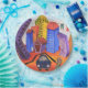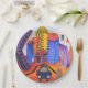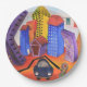 Una pintura colorida, divertida e imaginativa que representa a alguien en un auto saliendo de un pueblo con edificios doblados.