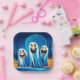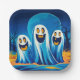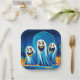 Noche de luna llena y tres lindos y sonrientes fantasmas listos para la fiesta de Halloween