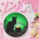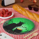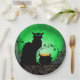 Una silueta del gato negro de Théophile Steinlen para el club Le Chat Noir en un ambiente moderno para el Día de San Patricio, donde se ve al gato con ojos verdes, una luna llena verde, una vid con rocas de champán y una olla de oro.