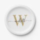Platos de papel personalizados con monograma inicial elegante simple moderno femenino blanco y dorado. Este diseño presenta su primer nombre en una tipografía de estilo de letra a mano bonita con cola de floritura (o caligrafía) con monograma inicial en dorado y negro sobre fondo de color blanco. Estos son fáciles de personalizar. Genial para inauguración de casa, también para cumpleaños, boda, fiesta de cumpleaños de 16 años, despedida de soltera, fiesta de graduación, baby shower y es para la chica que ama cosas minimalistas únicas.