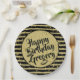 Celebra tu cumpleaños con estos divertidos platos de papel rayado en negro y oro. El diseño geométrico de moda es un patrón de rayas negras y doradas con confeti. Hay un círculo dorado en el centro para el texto y una plantilla de texto para que pueda cambiarlo fácilmente a sus propias palabras, nombre o evento. Este diseño es adecuado para todas las ocasiones, incluyendo fiestas de cumpleaños, duchas, aniversarios, graduaciones, y más; sólo cambia el texto para que coincida con el evento.