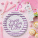 Celebra tu cumpleaños con estos divertidos platos de aqua y papel de rayas blancas. El diseño geométrico de moda se basa en el acua y en las franjas blancas con confeti. Hay un círculo blanco en el centro para el texto y una plantilla de texto para que pueda cambiarlo fácilmente a sus propias palabras, nombre o evento. Este diseño es adecuado para todas las ocasiones, incluyendo fiestas de cumpleaños, duchas, aniversarios, graduaciones, y más; sólo cambia el texto para que coincida con el evento.