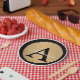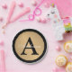 Personalice este botón metálico dorado delineado en placas de papel redondo negro con cualquier apellido y monograma personalizado.