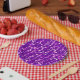 Una cascada de notas musicales en rosa, orquídea, lavanda, amatista y blanco sobre un fondo violeta profundo