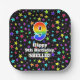Este alegre y alegre diseño de placas de papel con temática de cumpleaños presenta un gran número "9" con un patrón inspirado en el gradiente del espectro arcoiris. También incluye el mensaje "Feliz Noveno Cumpleaños", y un nombre editable. El fondo cuenta con un interesante y colorido patrón con muchas estrellas de colores y tamaños diferentes. Coloridas placas de papel como esta pueden ser divertidas de usar en un fiesta en honor al noveno cumpleaños de alguien. [~Z0000582]