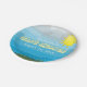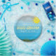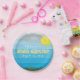 El diseño presenta un brillante sol brillante, nubes y hierba verde sobre rayas de degradado azul. El texto del nombre y la fecha son totalmente personalizables.