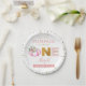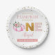 Celebra el primer hito de tu bebé este otoño con tus amigos y familia para compartir la alegría de tu pequeño. Este lindo plato de papel presenta una calabaza rosa acuarela con rosas caídos, follaje verde, purpurina dorado y un texto de plantilla fácil de personalizar.
