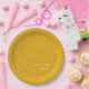 Se muestra este plato de papel impreso de estrellas pequeñas doradas en un color amarillo melódico personalizado. Las estrellas no son oro metálico ni oro fino, simplemente un color dorado. Estrellas en 3/4 del plato. Nombres personalizados para el personalizar de su propio nombre o frase. Cree su propio color utilizando la opción de color personalizado. Se muestra el tamaño de 9". Personalizar este artículo o compra tal cual.