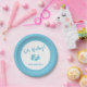 Un lindo y simple bebé, un plato de papel de ducha, presenta "¡Oh bebé!" en un guión elegante de color azul pastel, una acuarela coordinadora de pies de bebé, y el nombre de la futura madre en un guión contemporáneo.