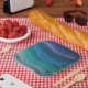Conjunto de platos de papel cuadrados impresos con diseño gráfico de olas saladas de la playa costera sobre negro por TheFabricSeal en Zazzle #ZazzleMade https://www.zazzle.com/store/thefabricseal