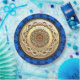 Una bandeja de la Pascua metalizado ornamentada con un fractal 3D Magen David (Estrella de David). La placa está superpuesta sobre una imagen de fondo de color azul con múltiples Magens David. El texto en hebreo en la placa dice: "מ צ ה" (matzah) y "פ ס ש snihtsnistris" (pesach sameach - Happy Passover).
