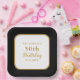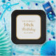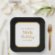 Platos de papel cuadrado negro, blanco y dorado para una fiesta de cumpleaños número 50. Este diseño de plantilla permite personalizarlos con el nombre de la dama de cumpleaños, hito y fecha.