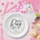 Platos de papel de oro moderno negro nombre él le puso un anillo. El diseño tiene un anillo de compromiso. Genial para fiestas de despedida de soltera para la futura novia.