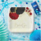 Flores rojas y negras románticas de hojas doradas con placas botánicas de papel boda.