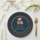 Agrega un encanto atemporal a tu celebración con estos platos de papel para baby shower de la colección "Osito Teddy Clásico", disponibles exclusivamente en Zazzle. Con un adorable osito Teddy vintage que lleva un lazo rojo, un borde elegante a cuadros azul marino y verde, y detalles lujosos en dorado, estos platos complementan perfectamente cualquier tema de baby shower clásico, elegante o invernal.