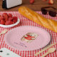 Placas de papel con un bonito ilustracion acuarela. Un oso de peluche marrón cargando un gran corazón rojo. La polka amarilla clara tiene un fondo rosado.
